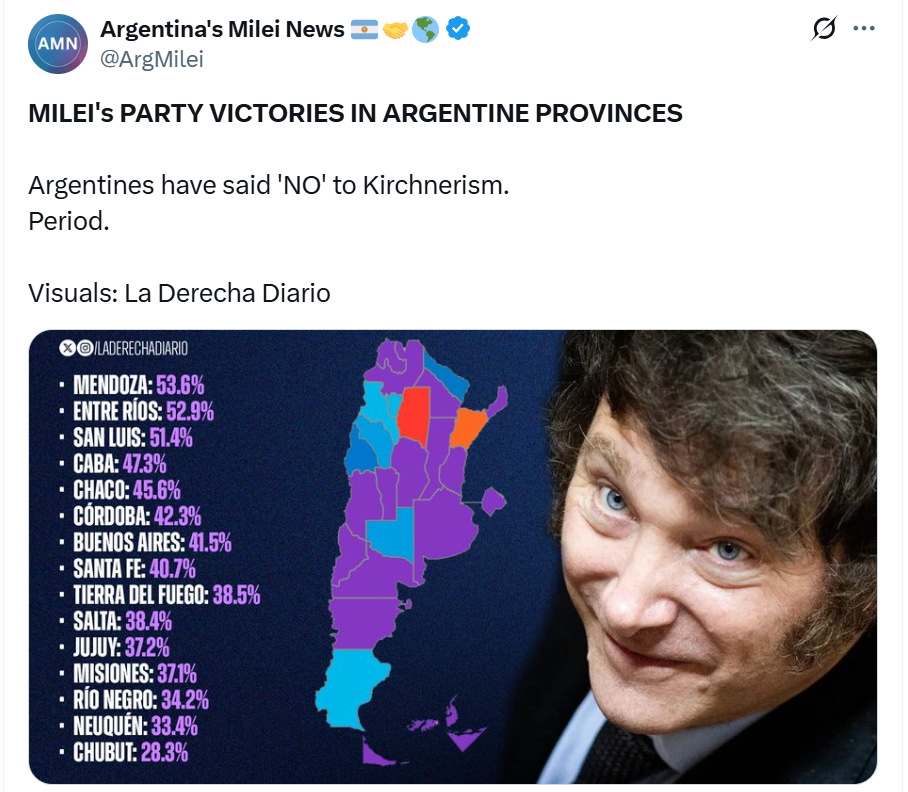 However, it is not doom and gloom; this is a historical weakening of Peronism. This will reshape provincial politics and governors. Local parties will start to see LLA as a pragmatic and reasonable rather than an idealistic and radical choice. Argentina will shift to market-oriented politics and away from populist consensus.