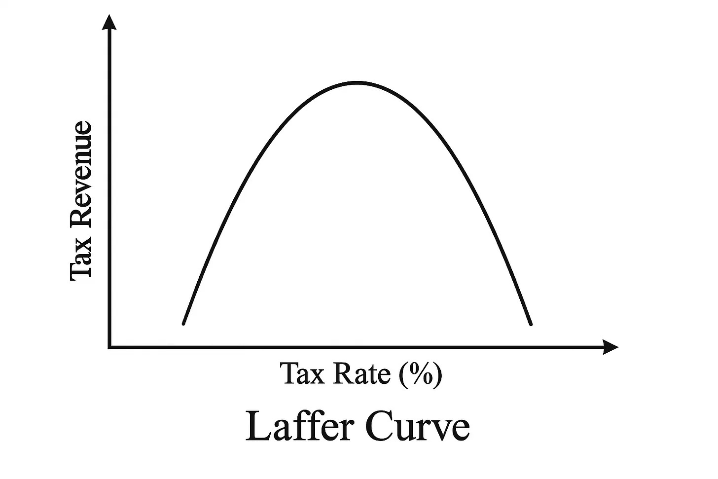 This diagram illustrates the relationship between tax rates and tax revenue, demonstrating that at both 0% and 100% tax rates, governments collect no revenue - either because there's no tax or because people have no incentive to work. The curve suggests there exists an optimal tax rate that maximises government revenue, beyond which higher rates become counterproductive and actually reduce total collections.