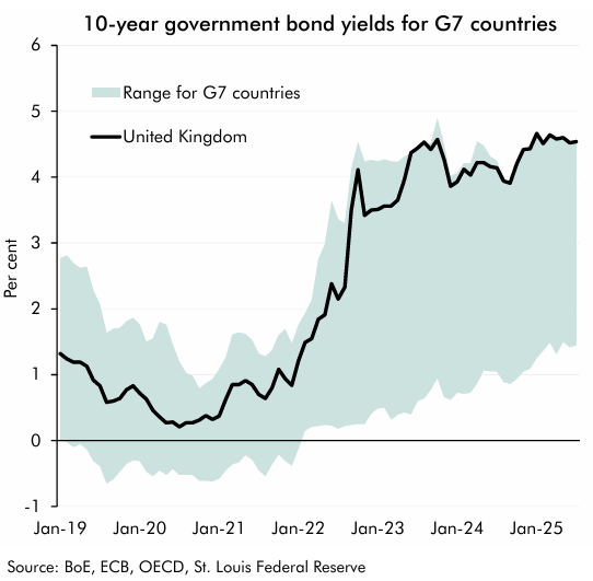 The UK’s cost of borrowing is now consistently at the top of the range of G7 economies. As Julian Jessop argues, our public debt is now among the highest in the same category, so this reflects a lack of fiscal credibility.3