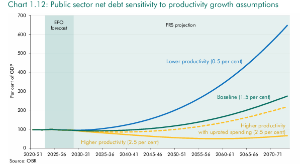 While not much has changed since last year’s OBR report, the warning is still prescient: if long-term productivity growth is just 0.5% a year, debt will reach an astonishing 647% of GDP by 2073-74.