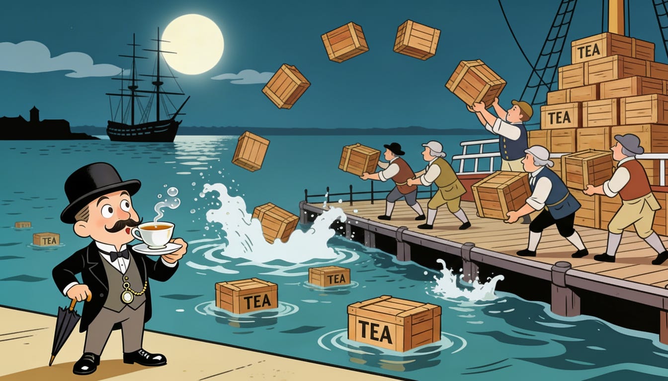 Some two hundred and fifty years ago, an aggravated band of colonists picked up their firelocks and fowling-pieces, threw the equivalent of 18.5 million bags of tea into Boston harbour and gave the Crown a good kicking.