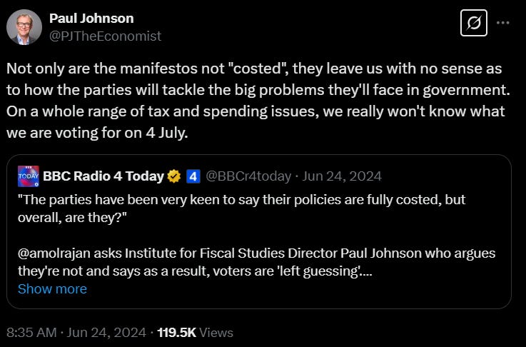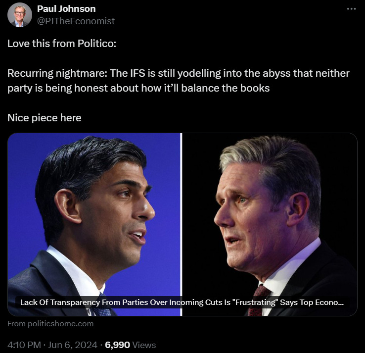 In the last General Election, both the Conservatives and Labour spent their time pretending that the public finances were not as they are. The IFS before, during, and after the GE repeatedly warned that politicians were not being honest about the state of the public finances or the trade-offs necessary for the next Government20. The election was run by both parties on a make-believe premise, because this was easier than telling the voters the truth.