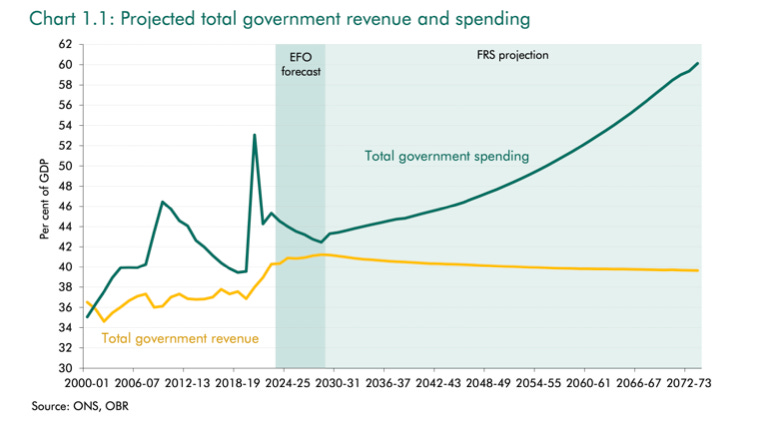 The most recent fiscal risks and sustainability report from the Office for Budget Responsibility provides a stark illustration of spending soaring beyond revenues: