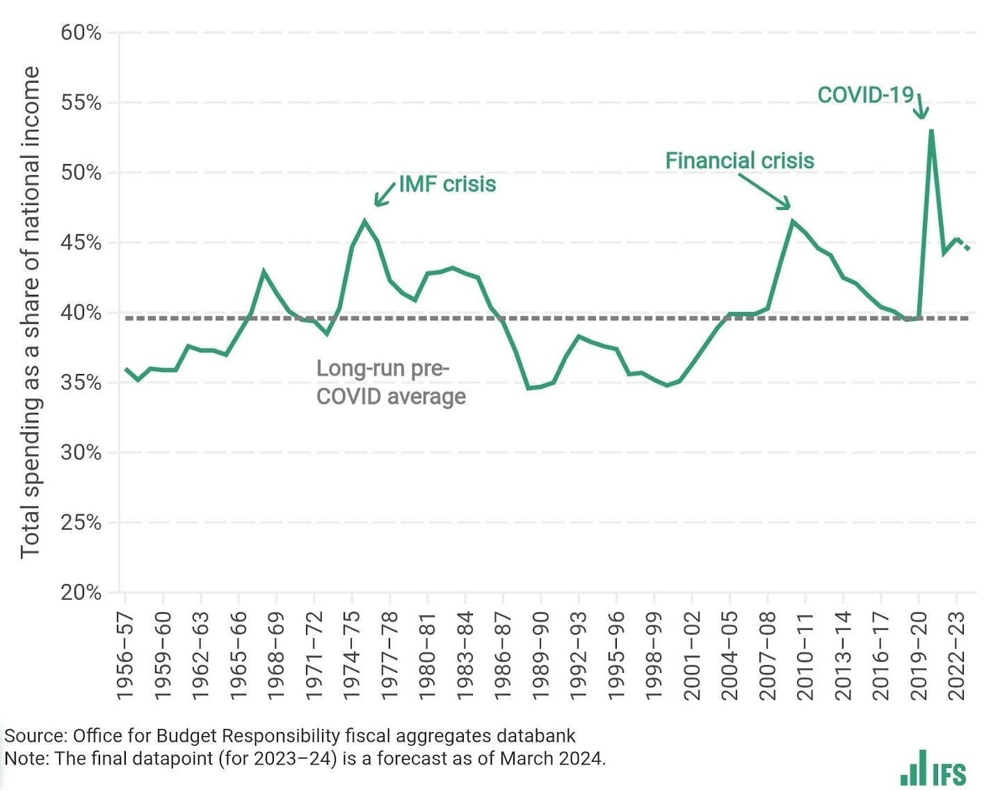 Despite political posturing, the truth is that the UK hasn’t tried the way of the small state in the post-WW2 era. Yes, there have been periods in which Governments have slightly reduced the size of the state and its expenditure, such as during the Cameron-Osborne austerity or Thatcher’s time in power. But for over 70 years, public spending as a share of national income has never fallen below 34%. Indeed, even the austerity of the 2010s only moved the UK’s state spending back to its long-run pre Covid average. This has meant that the fundamental problems that the UK faces have been growing for over 70 years.